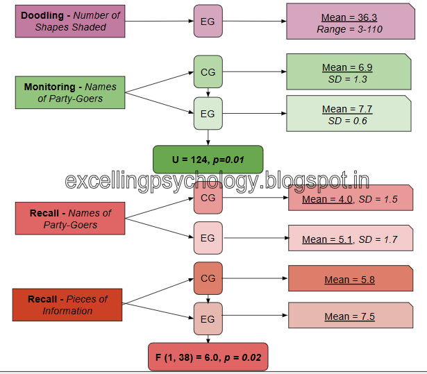 - Doodling - Half the participants - the experimental group - were asked to perform a doodling task while monitoring the message while the other half -the control group - were asked to simply monitor the message.